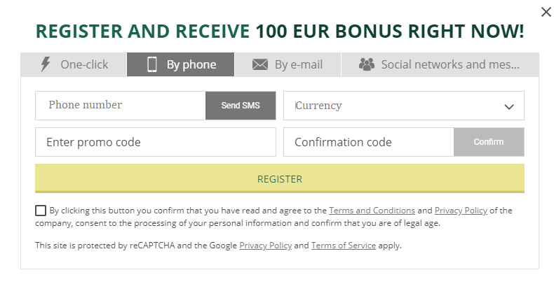 Ang pangalawang pagpipilian ay ang pagrehistro sa pamamagitan ng TELEPONO. Kailangan mong ipasok ang iyong numero ng telepono at makakatanggap ka ng isang SMS na may kodigo ng kumpirmasyon. Ipasok ang code sa field, pumili ng iyong pera, at ipasok ang promo code kung mayroon ka. Tandaan ang kahon na nagpapahayag na tumatanggap ka ng mga Tuntunin at Kundisyon at Patakaran sa Pagkapribado at i-click ang Register.